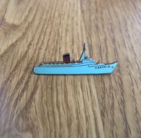 One of my all-time favorite ships (as many of you already know if you’ve read the descriptions on Luxury Liner Row) is Cunard’s Caronia. To me she is the epitome of Cunard’s British style with warm woodwork, comfortable furniture, and larger-than-normal cabins. This figural lapel pin was sold in her gift shops, and I love to wear mine when I’m on QM2. Excellent condition.