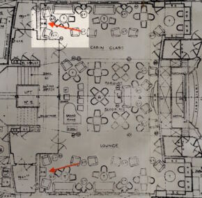 This comes to us directly from the auction of Caronia’s fittings in 1974. The previous owner purchased many one-of-a-kind items from Caronia and installed them in her 5th Ave. apartment. The items she purchased from the ship were so impressive that her apartment made the cover of Architectural Digest. I have purchased everything from Caronia that was in her apartment, and more items from this collection will be going up later this year. I have had the console completely restored, and it simply glows. It sports its original Formica top and has no issues or missing parts. All you would need to do it put it up and enjoy it. I have both of the consoles from the lounge, and I am keeping the other; so this will be the only one ever available. I have included a photo of my console so you can see the effect once it is mounted. It measures about 27” across x 17” deep x 26” tall. Note the general arrangement plans for the console marked “DW” for dumb waiter for their location in the ship.