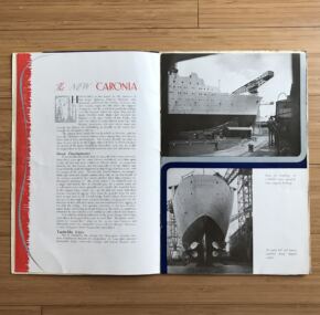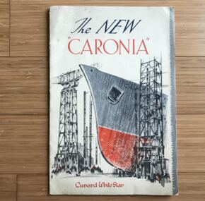 Not-often-seen brochure produced for the launch of the largest ship built anywhere since the end of WWII, Cunard’s incomparable Green Goddess, Caronia. Because of post-war rationing, promotional materials were not produced on the scale seen before the war, making this harder to find that those for the Queens. Eight pages, including a center double foldout. In very good condition! You all know how much I love Caronia, and I suspect many of you out there do too.