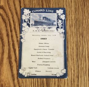 Embossed menu from Cunard Line’s famous RMS Carpathia. The ship that rescued RMS Titanic’s passengers needs no introduction. The menu is also quite nice with embossed grape leaves and vines and an image of the RMS Mauretania. Dated October 13, 1909. Captain Rostron was not yet in command of the ship (not joining as her captain until January of 1912), but no matter. Finding anything from this Cunarder is tough. Some slight paper loss and bumped corners.