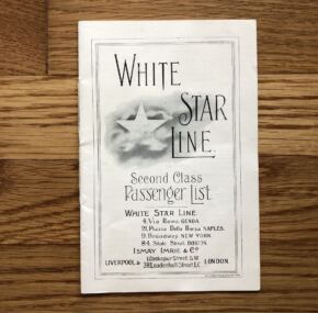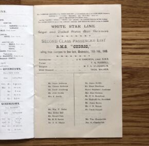 A second-class passenger list for the RMS Cedric’s crossing from Liverpool to New York, Valentines Day, February 14, 1906. Captain Cameron in command, and the surgeon is W.F.N. O’Loughlin of Titanic fame. The cover is that used on Titanic in second class. In very good condition. Add a great bit of Titanic to your collection for far less than what most authentic Titanic items fetch now days.