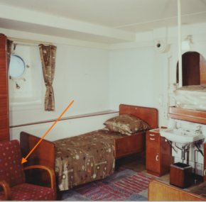 Originally used in second class on aboard the Mary, the chair was eventually transferred for use on Caronia. This may sound like an odd thing to do, but transferring furniture from ship to ship was actually quite common at Cunard. As furniture on the ships became worn or damaged, it was brought ashore for repair. When finished, it was placed in storage until needed again on the Mary (or another ship of the line).