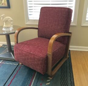 An amazingly comfortable solid-mahogany chair from a second-class cabin (B-54) on the Queen Mary. This chair has a fascinating history.