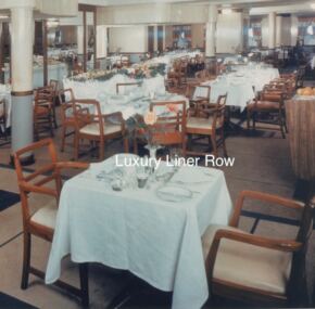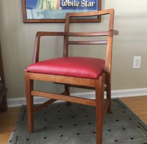 Made of solid mahogany, these chairs were a mess when I acquired them. Most of the finish was off, and they were rickety. They have recently come back from my restorer, and they shine like they were just put on the ship in 1936.