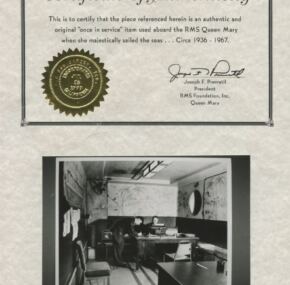 This chair was purchased by the prior owner at one of the sales on board the Queen Mary in the mid 1990’s, and it will come with a scan of the original certificate of authenticity that was given at the sale. It is in excellent condition with no damage to the upholstery. See archival photo for an identical chair in use in the Lounge. The lady in the image is well-known actress/singer Beatrice Lillie.