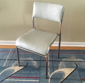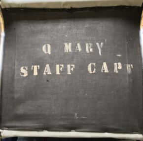 Useful and cool bent tubular metal Queen Mary chair. It is marked “Q. Mary, Staff Captain” on the bottom. These overflow chairs were brought in for situations where additional seating was needed in a lounge or for an officer’s party.