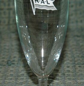 Champagne flute that stands 6½” tall. Excellent condition with a slight manufacturing flaw on the back. At some point in the 1960’s almost everyone switched from champagne saucers to flutes. I cannot decide which I like better. As long as it has champagne in it, right?