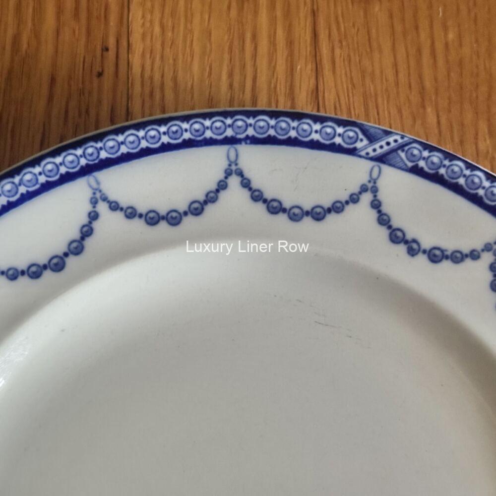 The famous “Bradford” pattern of White Star Line china. Now more famous than ever since its discovery inside the wreck of HMHS Britannic in the Aegean Sea. Boldly marked OSNC for Oceanic Steam Navigation Company. Back marked White Star Line and Stoniers. It is in excellent condition with some until marks. Measures about 9.25″ across. JF