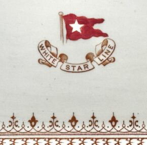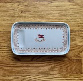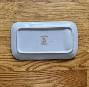 Asparagus plates are tough to source. One of the last patterns ever produced for White Star, dating from the late 1920s. All the typical marks, including Stoniers and the maker’s Keeling and Co. Very good condition with one small hairline and one small stain. No crazing and almost no utensil marks. Measures about 8.5″ x 5″.