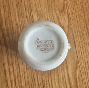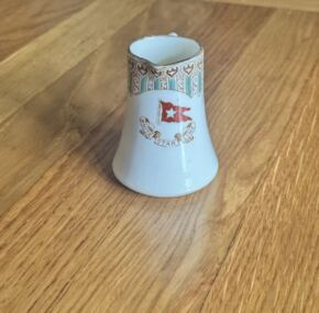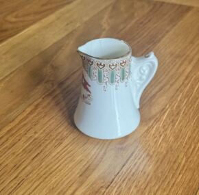 One of the nicest pieces of White Star china in the turquoise-and-brown pattern available. Lovely creamer with a full hand-painted White Star house flag on the front. This pattern was used on board White Star ships from 1889 to the 1930’s. Stands about 3″ tall. All of the turquoise tendrils of the pattern are complete with no loss of color, and the creamer is in excellent condition with 2 tight hairlines. JF