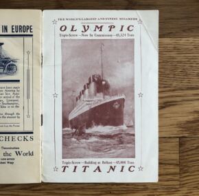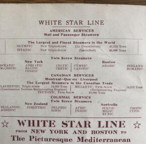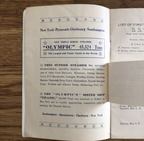 On page one the largest and finest steamers in the world Olympic (in commission and Titanic (launched) are mentioned. There is a full-page ad for Olympic that lists all the superb amenities on the vessel. Titanic is also mentioned as having been “launched at Belfast on May 31st and is now rapidly completing prior to taking her place in this service.” There is the famous tipped in notice about the fact “The attention of the managers has been called to the fact…. professional gamblers are in the habit of traveling to and fro in Atlantic Steamships. Lastly, the list ends with another full-page ad for Olympic and Titanic “The Largest Steamers in the World.”