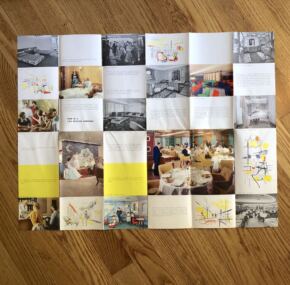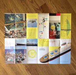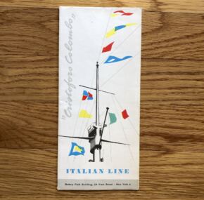 A glossy color foldout brochure printed September, 1958, for the Cristoforo Colombo. This is nearly identical to the Andrea Doria / Cristoforo Colombo brochure of a few years earlier. It has the same cover and many of the same images. A few of the on-deck photos still show the Doria despite her having sunk more than two years before! However, all the interior images from the Doria were replaced with the same spaces on the Colombo. Makes it interesting to see how the various spaces on the two sisters were different in decor. Very good condition.