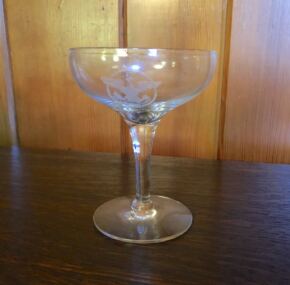 Super nice mid-century champagne saucer from the Big Ship, the ss United States. It stands about 4.5″ tall. In excellent condition. FC