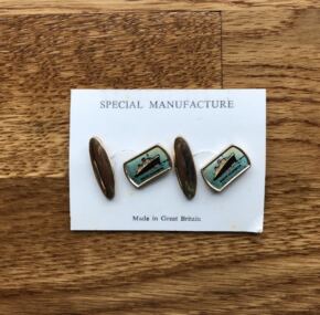 Cute enamel cuff links from the RMS Queen Elizabeth’s on-board gift shop. In great condition and still on the original card from the manufacturer. These were supposedly purchased onboard the QE2’s maiden voyage by the previous owner. I suppose Cunard moved new old stock over to the new vessel. That would jive with a lot of other choices made both in 1969 and 1936 for that matter.