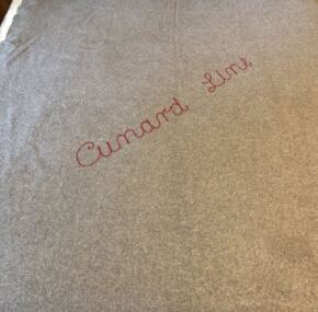 From the RMS Queen Mary. Purchased in Long Beach from the prior owner who bought it from the auction of ship’s fittings. This wool blanket is in remarkable condition given that it is 60+ years old. Boldly marked Cunard Line across the front in red and red trim across the top and bottom edge. You very rarely see anything from crew areas available for sale. Measures about 58″ x 71″