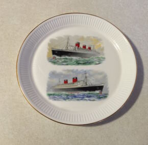 Very well-made bone china souvenir plate as sold in the gift shops of Cunard’s Queen Mary and Queen Elizabeth. As you would expect, this was produced by Staffordshire. This not-often-seen plate shows the images of both ships. Near-mint condition and measuring about 7” in diameter.