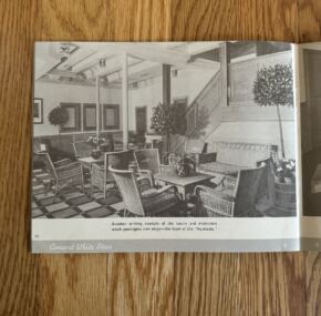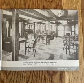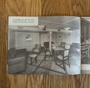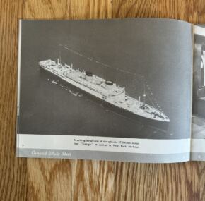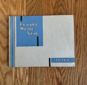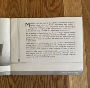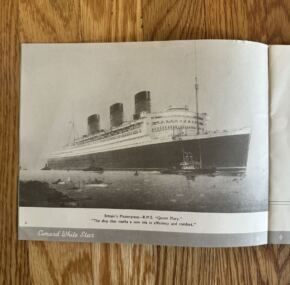 Here is a brochure rarely seen. In fact, I don’t think I have seen this cover before. 28-page third-class brochure produced for Cunard White Star before the RMS Queen Mary entered service as evidenced by the renderings of her and her interiors, not photos. Among the first Cunard White Star brochures ever produced. Ships included are Britannic, Aquitania, Laconia, Scythia, Samaria, Georgic, Lancastria, Franconia, Carinthia, and Berengaria.