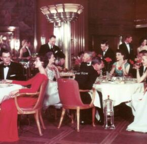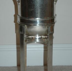 There’s silver, and then there’s silver. This immense champagne bucket and stand was designed with a heavy base to keep it upright in rough seas. Together these pieces measure over 18” tall. The bucket is 8” in diameter at the upper rim and 9½” tall. The stand is 13” tall. Both produced by Elkington plate. In the the pinewood pattern, the bucket and stand are each dated 1936.