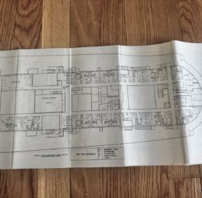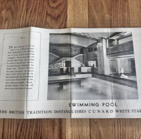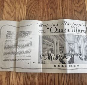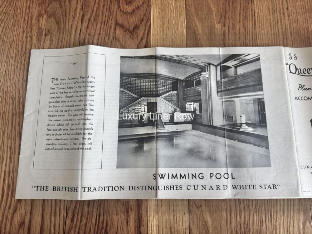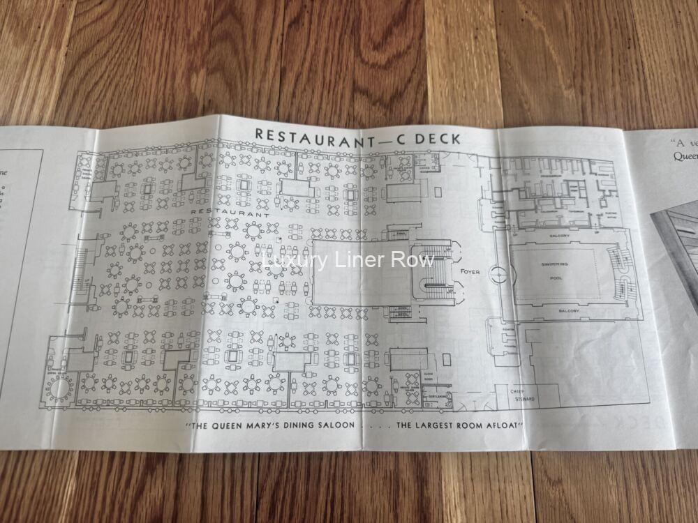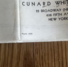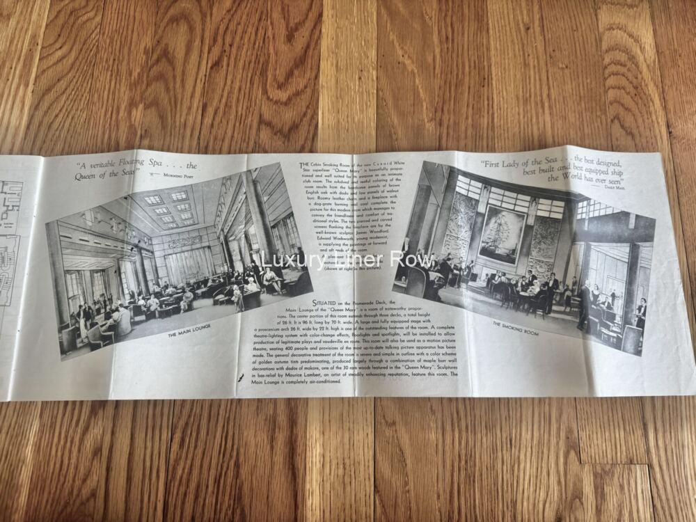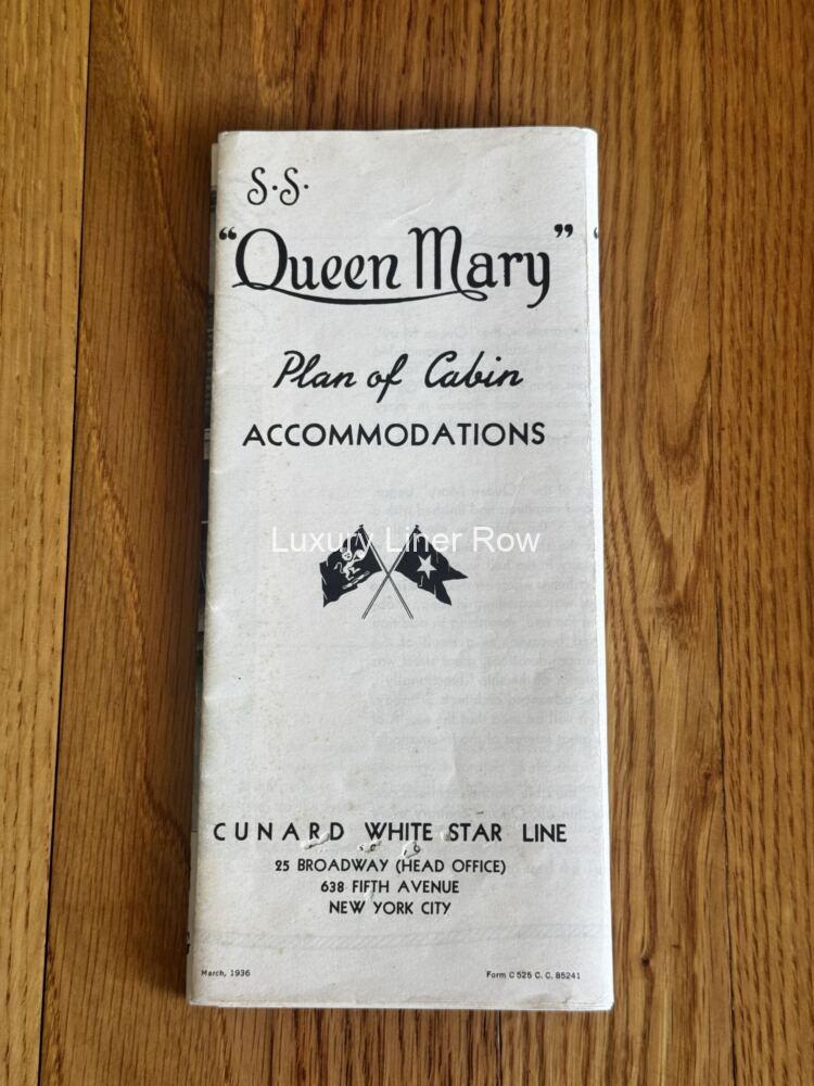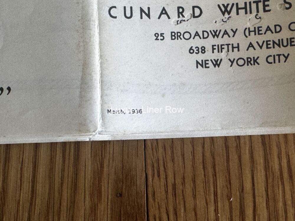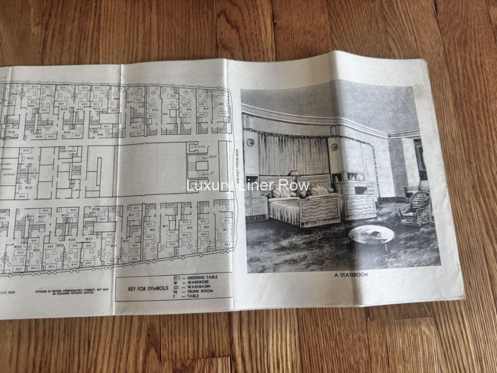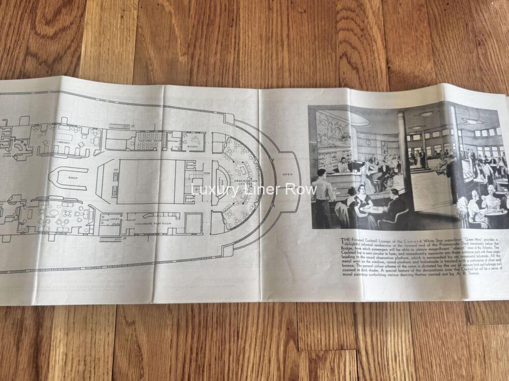 Dated March, 1936, this Cunard White Star Line deck plan showcases the upcoming first-class grandeur of the RMS Queen Mary. A couple of flea bites to the cover and some very slight discoloration the edge but otherwise great condition. Would be very interesting to compare this with later deck plans to see how things changed over the years. Pre-war deck plans for her are very difficult to come by.