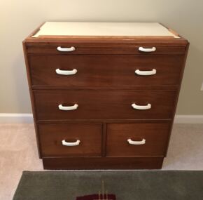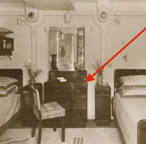 A superb example of pre-war Cunard White Star cabinetry. This dresser from second-class is made of solid mahogany. This is how high-quality furniture was made 80 years ago — built to last! However, the costs were simply too high post war to continue on with such largess, and Caronia and the Canadian quartet’s mahogany cabinetry was mahogany veneer over plywood. Complete with original handles and markings on the back showing its location on board. Measures about 32″ x 30″ x 18″. An excellent item of memorabilia that you can use on a daily basis as previous owners have since 1936! In my own collection is a very similar chest from the staff captain’s cabin on Caronia, which I use every day.