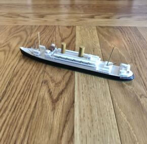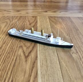 Van Ryper started his ship-modeling business in 1933 in Martha’s Vineyard. The idea was straight forward — make handmade models in a very recognizable style. The name is famous, and the models are outstanding. But being 80-90 years old now, they are quite rare. This is a Van Ryper model of Canadian Pacific Line’s RMS Duchess of Bedford of 1929. It is in very good condition with some chipping to the paint at bows, which could be quite easily corrected. The model was cherished by a collector all these years, and I was fortunate enough to buy his entire collection. In the original box from Van Ryper. Measures about 10″ long.
