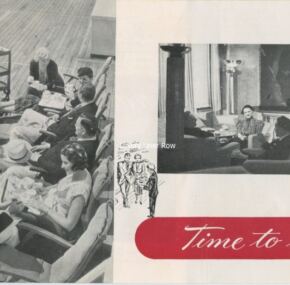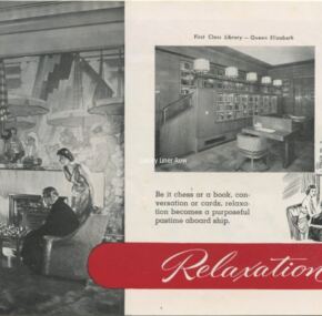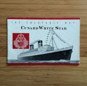 The height of Cunard White Star is perhaps represented in this brochure from 1949. Much talk of the pre-war ships being refitted “in keeping with the latest concepts of comfort and luxury in ocean travel.” In fact, Caronia is referred to as “Ultra modern in design… smart and modern as tomorrow….” Runs 18 pages and has loads of photos not to be found elsewhere. All three classes covered with such views as chess in the drawing room on the Mary, cocktails in the Long Gallery, and swimming on Caronia. Mint condition.