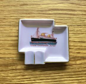 Turbinen Schnelledampfer! Or fast steamer. I’ll say! The Bremen and Europa were the bee’s knees in 1930. An attractive bisque ashtray in a pale pink for this famous German liner. Measures about 3.5″ x 3″ and in very good condition with some slight gold loss where the cigs rested. Coming up on 100 years old!