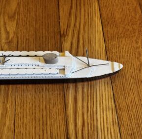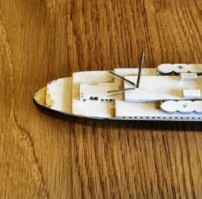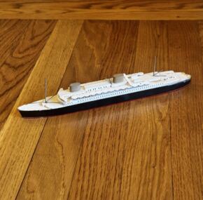 Two names stand out when it comes to ocean liner models. One of them is Van Ryper, and the models are in great demand by collectors. The name is famous, and the models are outstanding. This is a Van Ryper model of NDL’s impressive ss Europa of 1930. She, of course, went on to a long life as both Europa and later ss Liberte for the French Line. This longevity was despite the fact she sank twice and burnt twice! I’m not sure if I can think of another liner that went through so much. In very good condition with some slight discoloring to the white paint and a tiny chip of paint here and there. Measures about 10.5″ long. AC