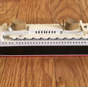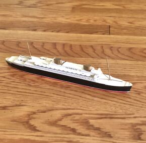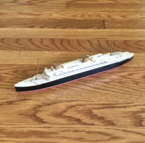 Two names stand out when it comes to ocean liner models. One of them is Van Ryper, and the models are in great demand by collectors. The name is famous, and the models are outstanding. This is a Van Ryper model of NDL’s impressive ss Europa. She, of course, went on to a long life as both Europa and later ss Liberte. This longevity was despite the fact she sank twice and burnt twice! I’m not sure if I can think of another liner that went through so much. In very good condition with some slight coloring to the paint on the poop deck. Measures about 10.5″ long.