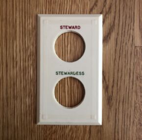What an unusual item and a rare survivor! A steward’s call plaque from a first-class cabin on board the Queen Mary. See one in use in the archival photo. Rarely seen. Mount it next to your bed!