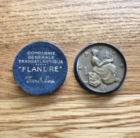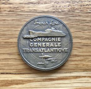 A resurgent and proud French Line brought out two new ships in 1952. The Flandre and the Antilles. This bronze medallion is the maiden voyage medal for the Flandre as sold in her on-board gift shops. In the original box! It is in excellent condition. Measures 2″ across. CGT made so many great medals for their ships over the years (more than 40!) that you can have great fun collecting the whole set.