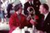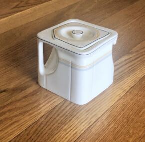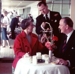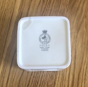 Foley bone-china tea pot, measuring just about 3¼” square and standing 3″ tall. Excellent condition. No cracks, chips, or crazing. Some slight wear to the black line on the lid. Displays well as a set with the larger tea pot (if you’ve got one!). Note the archival of the tea set in use in Queen Mary’s post-war garden lounge. It seems that these small tea pots were strictly for individual service, one per passenger. Note that both “passengers” in this publicity image have their own.