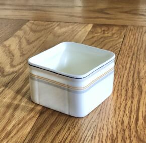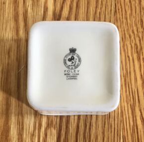 Although commonly referred to as a “large sugar bowl,” this is actually a waste dish for your spent tea leaves. In the late 1960’s, Cunard made the “bold” move of switching to tea bags. A risky decision that had serious consequences for the plumbing on board! This waste dish is 2½” square and 1¾” high. Excellent condition with no chips, cracks, or crazing.
