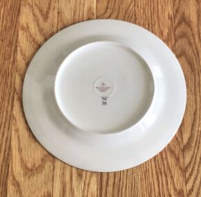 Elegant bone-china dinner plate from the celebrated ss France of 1962. The French Line really splashed out on the food with one critic suggesting the sea gulls followed the France instead of other ships since the food scraps were so good! This dinner plate is in very good condition with some slight wear to gold leaf.