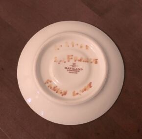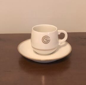 Very highly sought-after china demitasse cup and saucer in fine bone china as produced by Haviland for the French Line. The gold leafing is in very good condition, including the CGT on the cup although there appears to be a manufacturing flaw on the inside of the rim. Sets like this are getting tough to source at good prices from this, one of the most famous ships of all time.