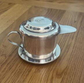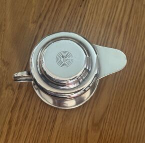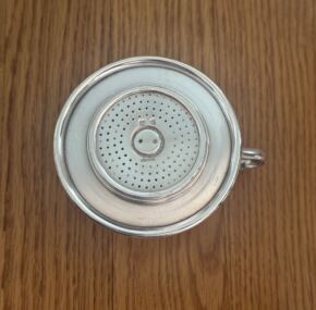 Beautiful and mint condition tea strainer by Christofle.  Imagine the art, care, and time taken for tea service on the liner that was often claimed to have finer food than anything ashore even in France itself.  Measures about 3″ tall and about 3″ across the base.
