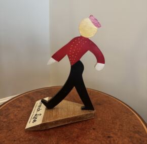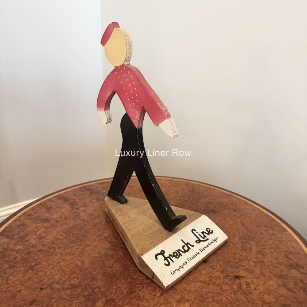 Unusual advertising piece for CGT.  Wooden cutout profile of an iconic French Line bellhop.  Stamped on the bottom with the name of the company that made it.  Stands about 11″ tall.  The French Line always did much better advertising pieces than Cunard!  In great condition.  MO