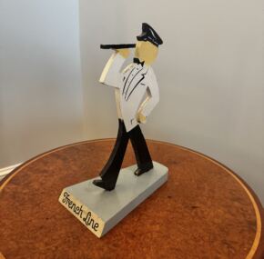 Unusual advertising piece for CGT. Wooden cutout profile of French Line steward. Stamped on the bottom “Property of French Line, Pier 88, North River, New York.” Stands about 10.5″ tall. In great condition. Can’t you just see this in a travel agent’s office? MO