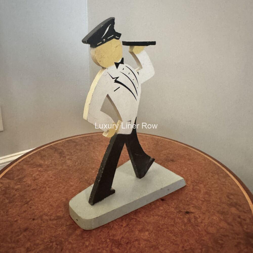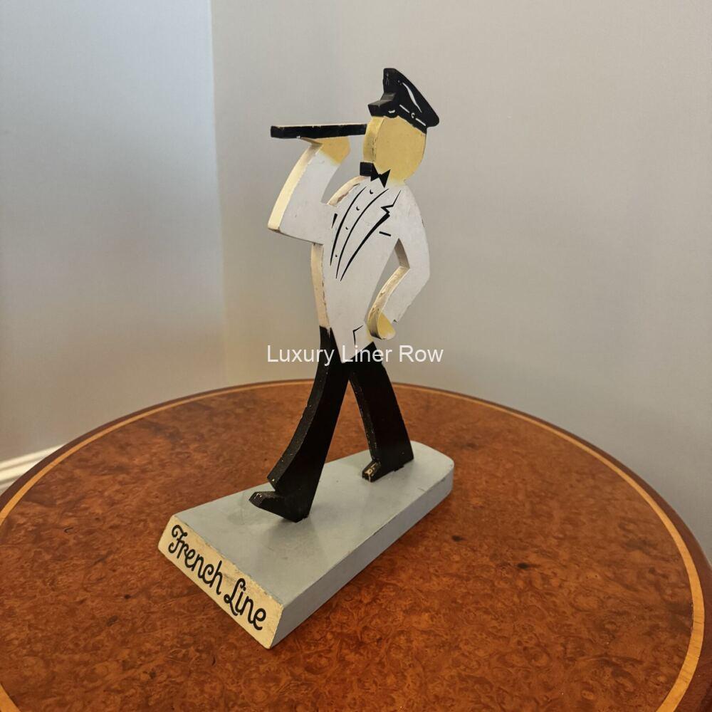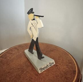 Unusual advertising piece for CGT. Wooden cutout profile of French Line steward. Stamped on the bottom “Property of French Line, Pier 88, North River, New York.” Stands about 10.5″ tall. In great condition. Can’t you just see this in a travel agent’s office? MO