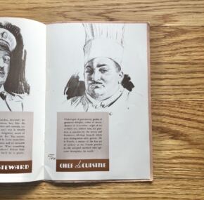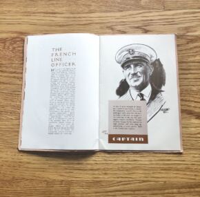 A fascinating brochure for the French Line from the ss Normandie era. As it says itself: “Who would dispute the statement that, without its personnel to give it soul, the most gigantic, most lavishly decorated and most costly steamer ever fashioned by the hand of man, would be but a lifeless, helpless, aimlessly drifting iron hulk?” Filled with high-quality pencil drawings of various crew members and the services they performed on board. These images must represent the actual people, and aren’t they Gallic in countenance. The chef de cuisine, for example, is called “Unseen god of gastronomy, genius of gustatory delights, sultan of sauces, dictator of delectables, caliph of the culinary art.” Wow! Each crew member gets a description like this. Those listed are the Captain, Doctor, Purser, Chief Engineer, Inspector, Chief Steward, Chef de Cuisine, Orchestra Leader, Wireless Operator, Guignolist, Stewardess, Sports Director, Barman, Mousse, Governess Nurse, and Seaman. What a list! A fun read and a worthy addition to any CGT collection.