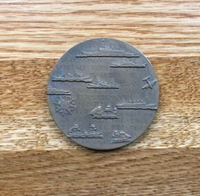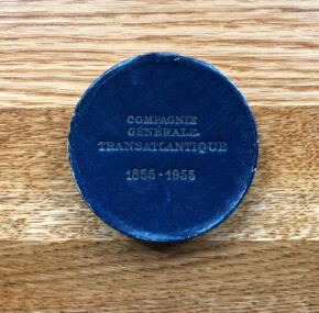 A very proud French Line produced this bronze medal in 1955 for the 100th anniversary of the company. Perhaps in a bit of austerity following the war, the size of the medals produced in the 1920’s and 1930’s was reduced by about half in the post-war period. Not, however, for the centennial celebrations. CGT splashed out and went back to the pre-war size and thickness. In excellent condition and in its original box. Measures about 2.5″ across.
