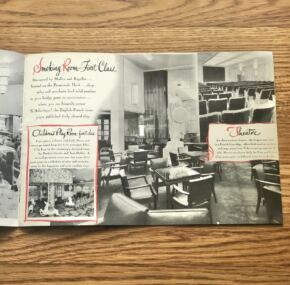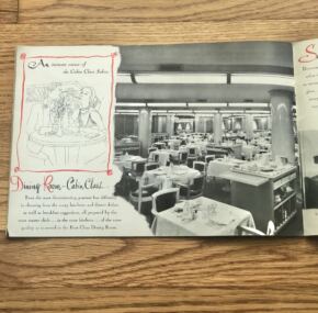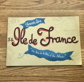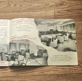 I haven’t had this one in a while. A fantastic brochure for the French Line’s famous ss Ile de France. What can be said about her–one of the most famous liners of all time and one of the top 3 for CGT. From her ground-breaking entry into service and her trend-setting interiors right up to her heroic rescue of the ss Andrea Doria’s passengers. Finally, her ignoble end as a prop in a Hollywood movie. Has color illustrations covers all three classes and a huge centerfold of the ship. I’d love to own that painting! In very good condition.