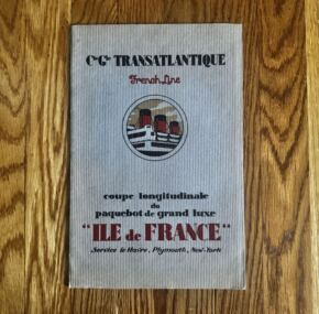 Magnificent full-color cutaway of the trend-setting ss Ile de France.  Simply amazing condition.  You could sit and look at this for hours–and I almost have!  Explore the ship using this amazing cutaway.  JF