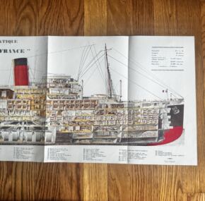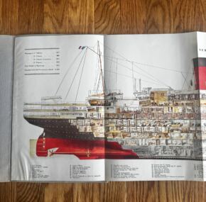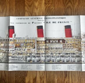Magnificent full-color cutaway of the trend-setting ss Ile de France.  Simply amazing condition.  You could sit and look at this for hours–and I almost have!  Explore the ship using this amazing cutaway.  JF