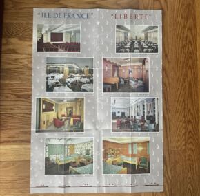 Early 1950’s glossy foldout brochure showcasing 15 amazing and jaw-dropping color photos of first class on the ss Liberte and ss Ile de France. Very rarely do we see color interior brochures or photos of these lovely liners. In French and really quite difficult to find. Very small holes at folds else excellent. JF