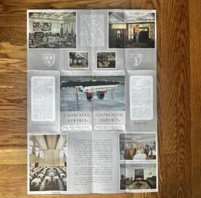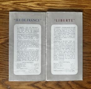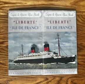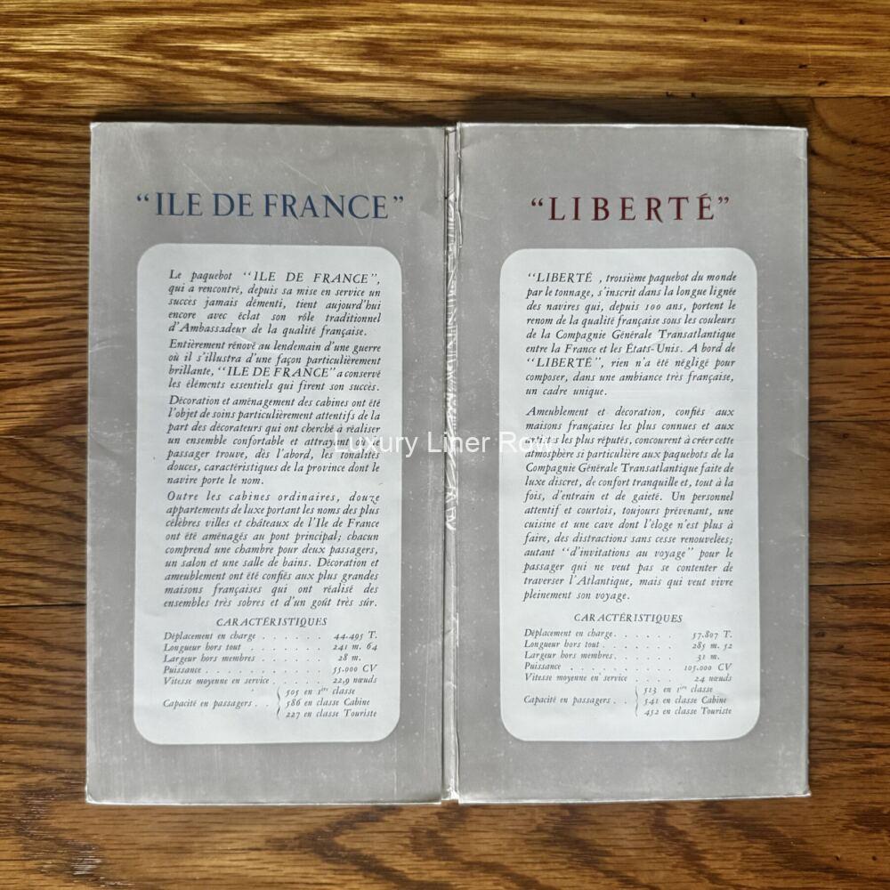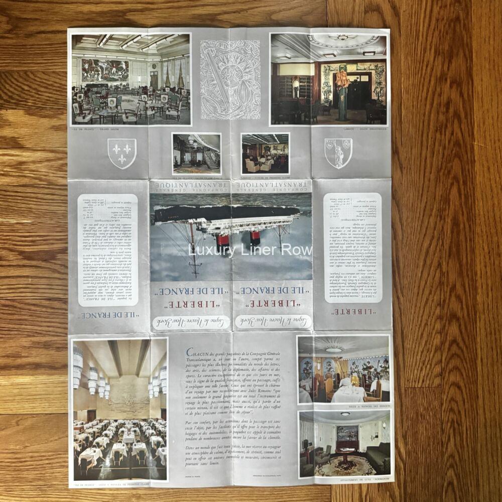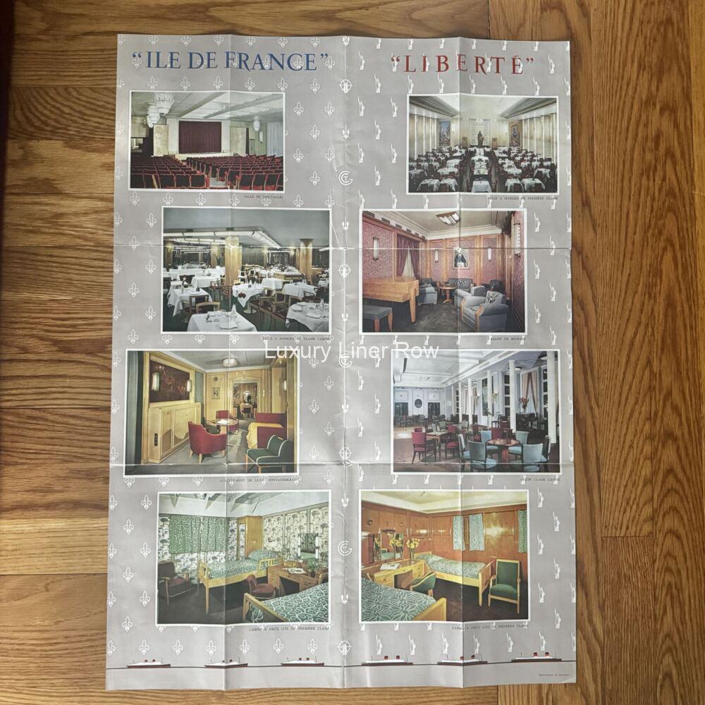 Early 1950’s glossy foldout brochure showcasing 15 amazing and jaw-dropping color photos of first class on the ss Liberte and ss Ile de France. Very rarely do we see color interior brochures or photos of these lovely liners. In French and really quite difficult to find. Very small holes at folds else excellent. JF