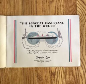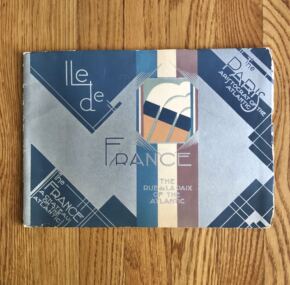 An exceedingly rare brochure for the French Line ‘s fantastic Ile De France, the Paris, and the France. 24 pages with full-color, mostly full-page renderings, half for the new Ile, and the other half split between the France of 1912 and the Paris.