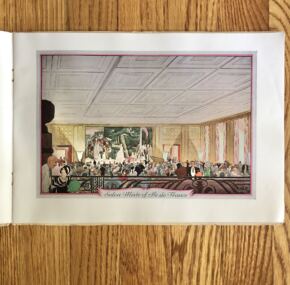The brochure claims the walls of the Ile are poems of rare woods. I am sure it is true, and what a colorful way to put it. A really fantastic brochure that is nearly 100 years old. Even the end papers are cool with very Art Deco styling. Some chipping to the edge of covers and the center page has separated but otherwise quite nice.