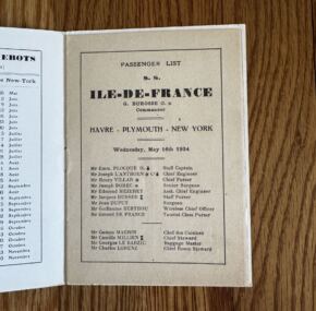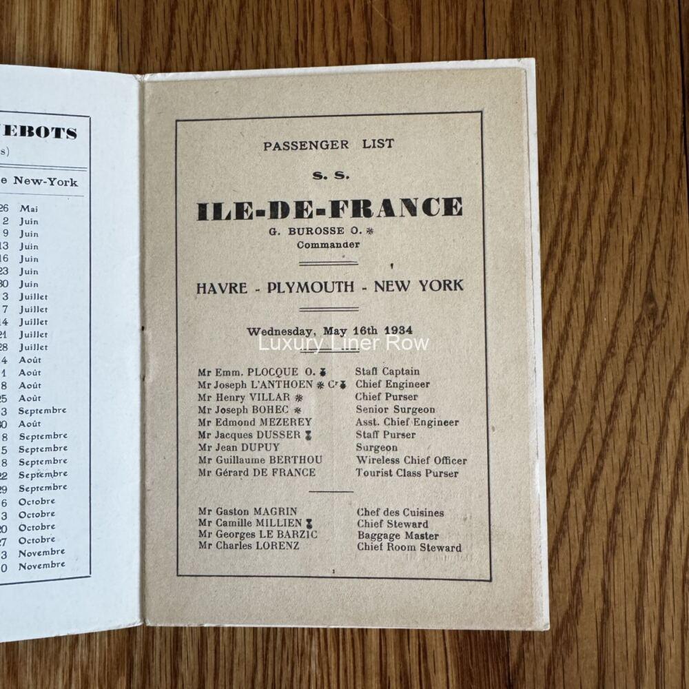 Lovely passenger list for the Ile de France dated May 16, 1934. Lists officers, including the very well-known and liked Henri Villar, who went on to be the Chief Purser of the Normandie a few years later. A mere 390 passenger on board because of the worsening Depression. Covers both first and second class. Tiny tear on the cover. JF