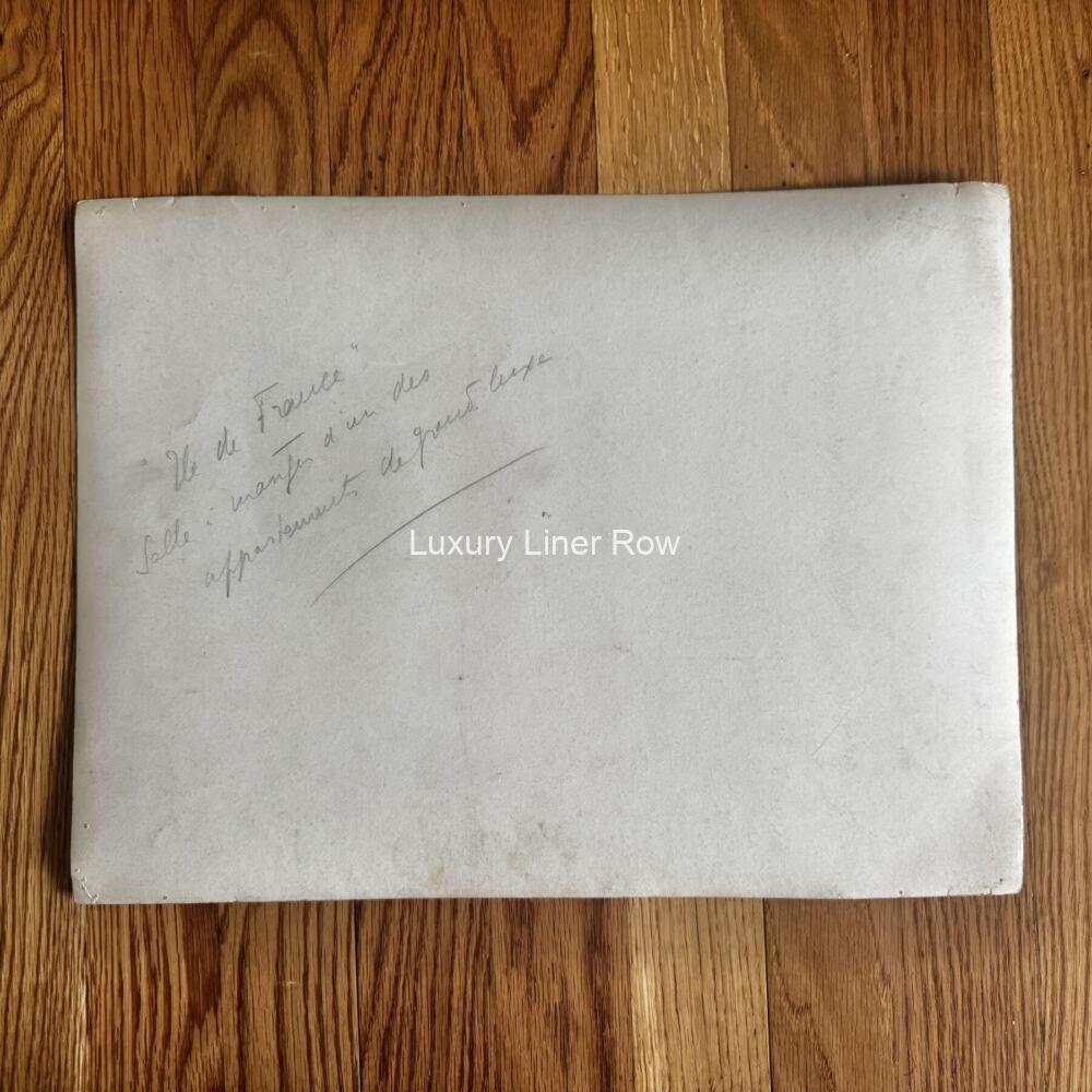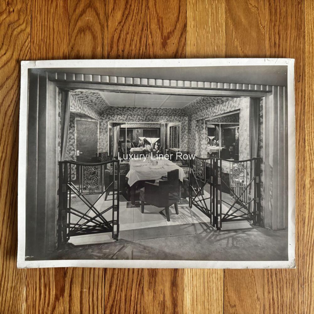 Huge publicity photo of the dining room of one of the grand luxe suites on board the French Line Ile de France, one of the most beautiful Art Deco liners ever built. When looking at this image, it’s hard to believe that this is on an ocean liner. She was truly lightyears ahead of her competition. 15.75″ x 11.75″. Very nice condition. JF